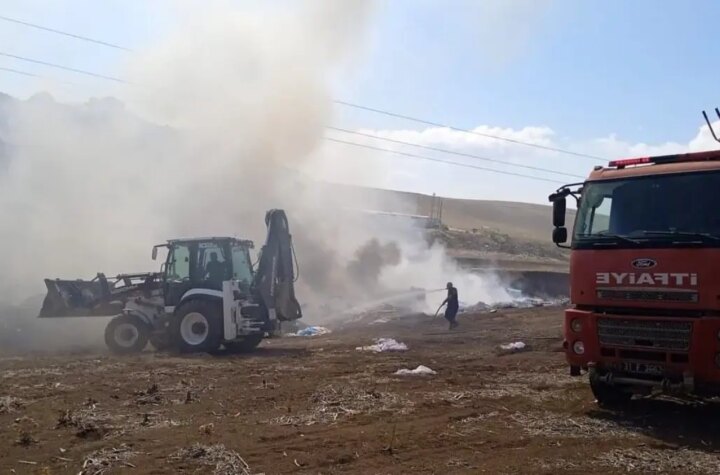 Kırıkhan ilçesi Mimar Sinan Mahallesi'nde inşaat atığı ve çöplerin bulunduğu alanda çıkan yangın, itfaiye...