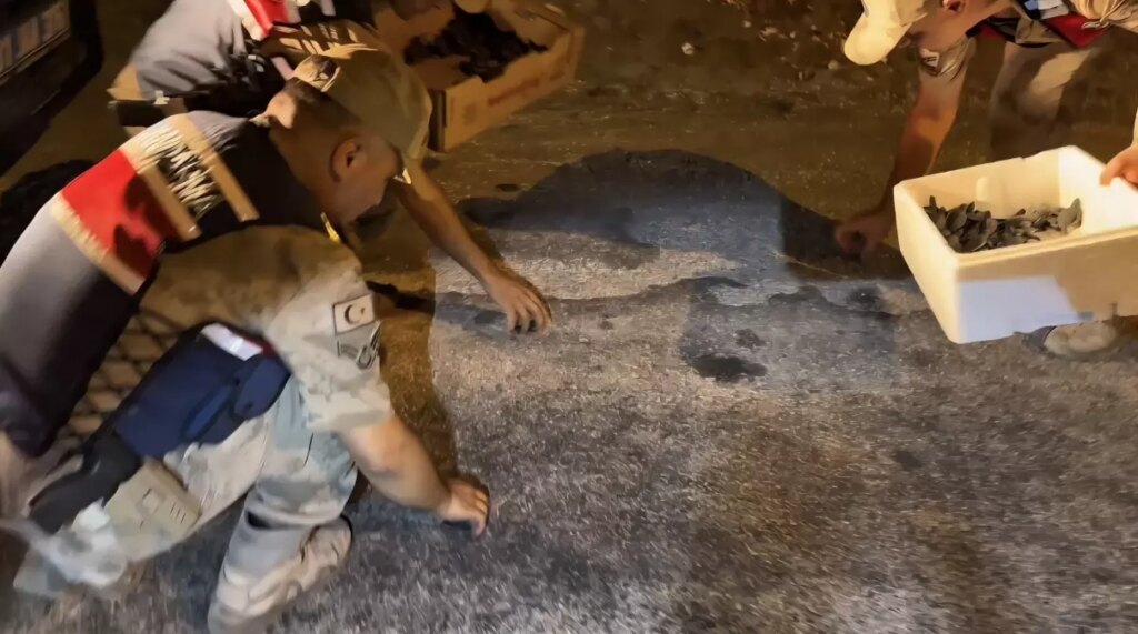 HATAY’ın Samandağ ilçesinde yumurtalarından çıkıp istikametini kaybeden 592 yeşil deniz kaplumbağası (Chelonia mydas) yavrusu, jandarma takımlarının tarafından denize ulaştırıldı.