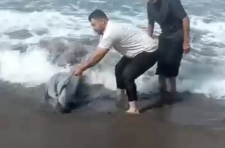 Hatay'ın Samandağ ilçesinde kıyıya vuran yunus, etraftaki vatandaşların yardımıyla denize geri bırakıldı. O anlar...